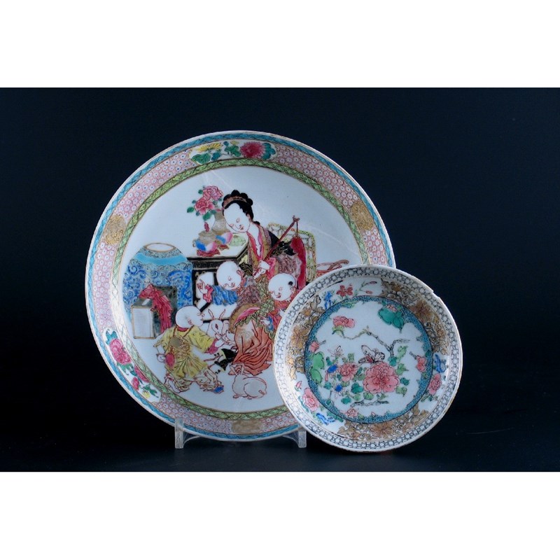 A Chinese famille rose saucer dish, painted with a mother, three children, a hare and a deer together with a saucer. Both damaged. Both Yongzheng 1723-35, 19.5cm. (2)