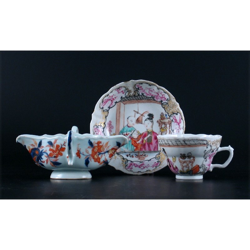 A Chinese Imari double ended sauceboat, and a Chinese famille rose moulded cup and saucer. Minor faults. All 18th century. (3)