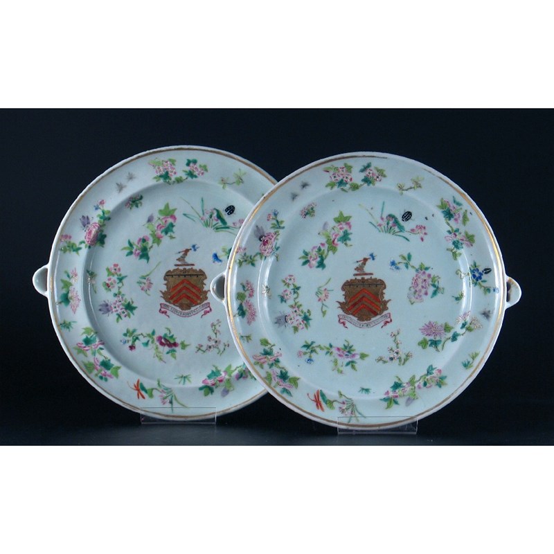 A pair of Chinese famille rose armorial warmer plates, decorated with sprigs of flowers and insects. A little wear to the gilding. Late 18th century, 27cm. (2)