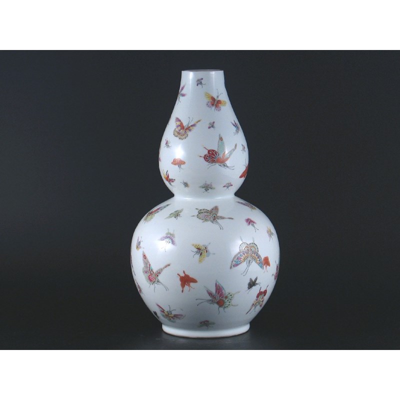 A Chinese famille rose double gourd vase, decorated with numerous butterflies, Qianlong four character mark but later, 36cm.