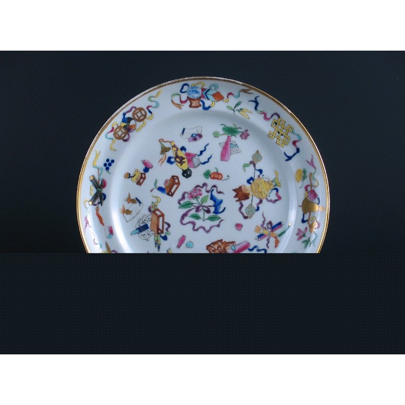 A Chinese famille rose plate, brightly decorated with auspicious symbols, a gilt rim, 19th century, 20cm.
