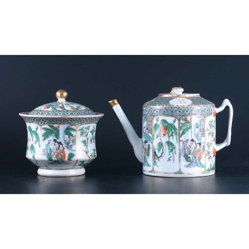 A Chinese Canton famille verte teapot and cover, and a matching sugar basin and cover, decorated with panels of figures and birds, each with an 'M' in a panel, 19th century. (4)