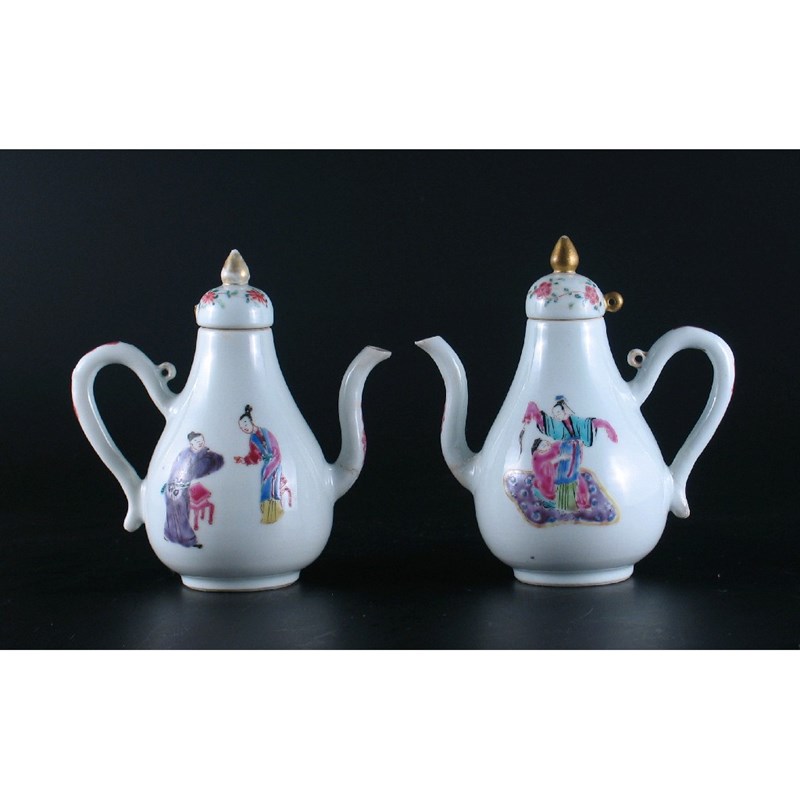 A pair of small Chinese famille rose ewers and covers, decorated with figures in various pursuits. Both with damages. 18th century, 13.5cm. (4)