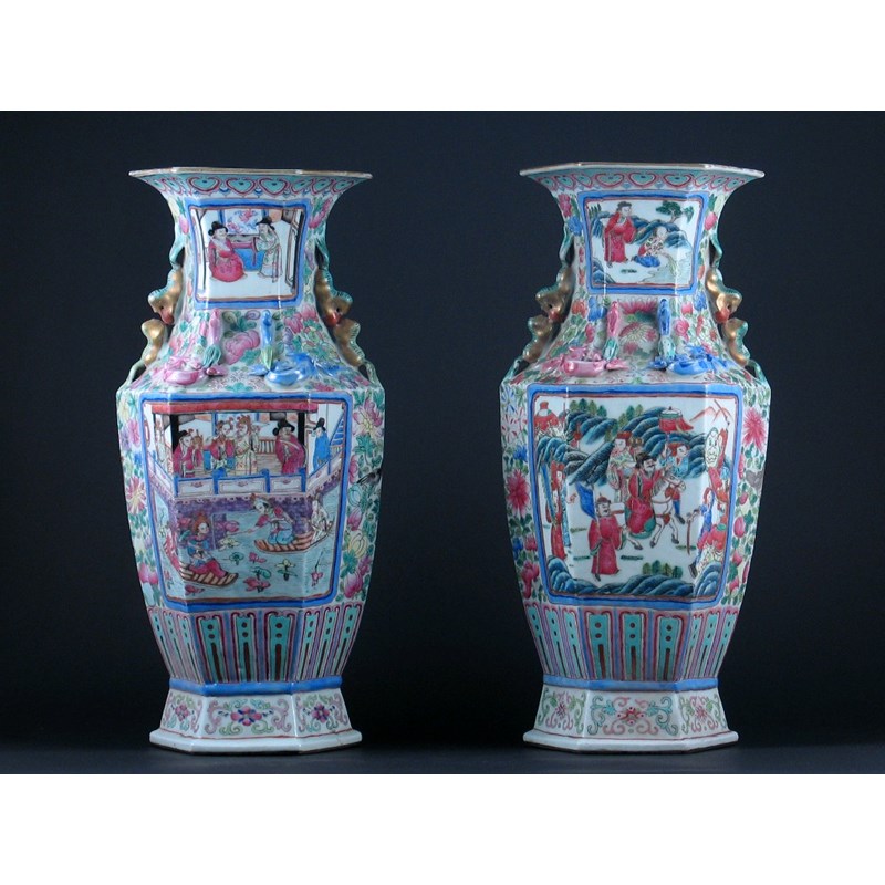 A pair of Chinese Canton famille rose hexagonal-section vases
