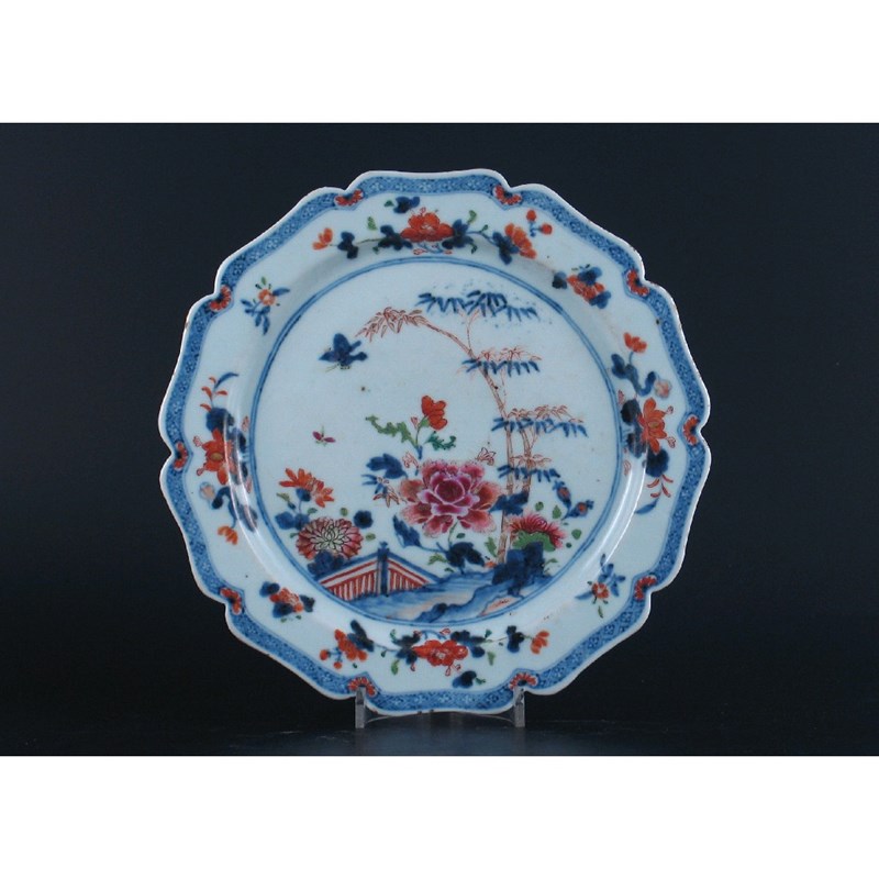 A Chinese famille rose dish, with a shaped border, painted with peony, bamboo and chrysanthemum, c.1740, 26.5cm.