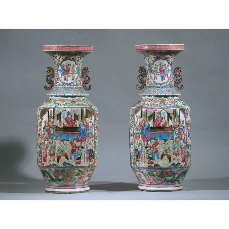 A large pair of Chinese Canton famille rose vases, decorated with panels of figures on a floral ground, 19th century, 61cm. (2)