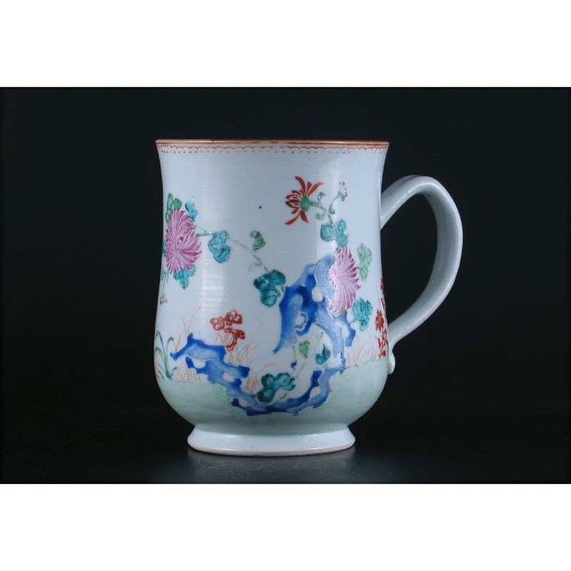 A Chinese famille rose bell-shaped mug, painted with flowers issuing from blue rockwork Qianlong 1736-95, 15.5cm.