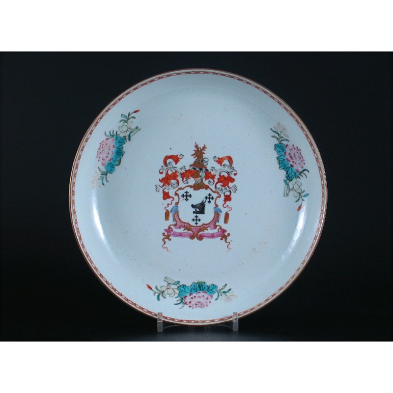 A Chinese armorial saucer dish, the centre painted with the arms of Amyas of Norfolk and with three lotus sprays, Qianlong c.1750, 26cm.