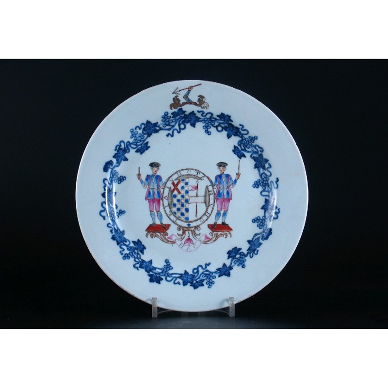 A good Chinese armorial plate, painted with the arms of Warren impaling ?, with two figures flanking an oval shield, within a vine border, c.1750, 23cm.
