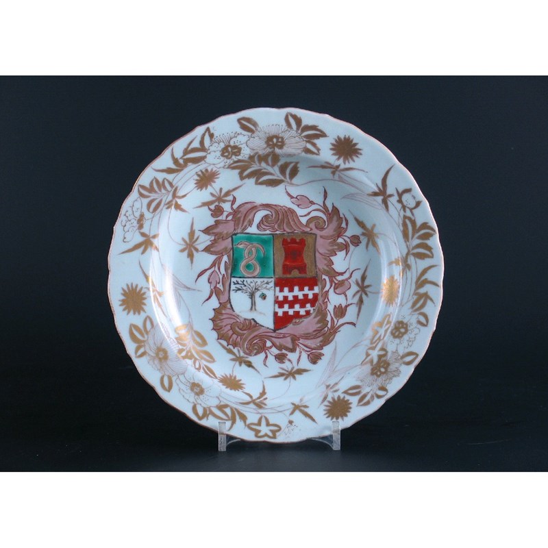 A Japanese armorial soup plate, decorated with a central quartered shield on a ground decorated with gilt flowers and foliage, late 17th century, 22.5cm.