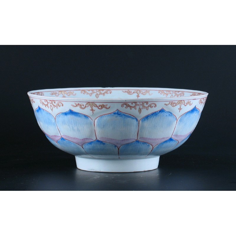 A Chinese famille rose lotus bowl, painted in shades of pale blue, pink and with gilt and iron red scrollwork, the interior with a large flower spray. Extremely faint hair crack. 18th century, 23cm.