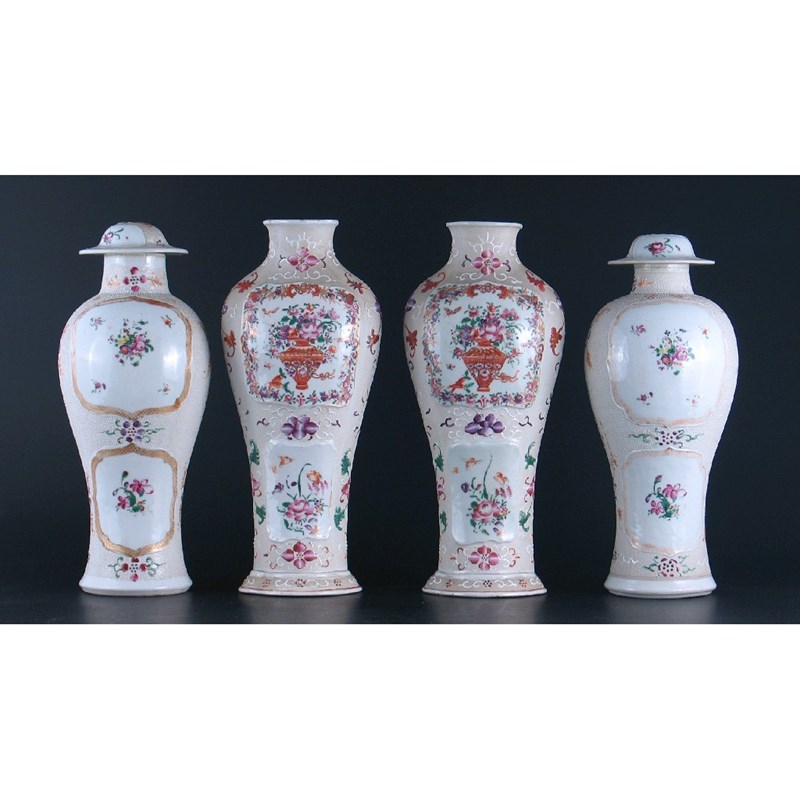 Two pairs of Chinese famille rose vases, two with covers, all decorated with flowers and foliage on a simulated shagreen ground. Damages. All Qianlong 1736-95, 28cm. (6)