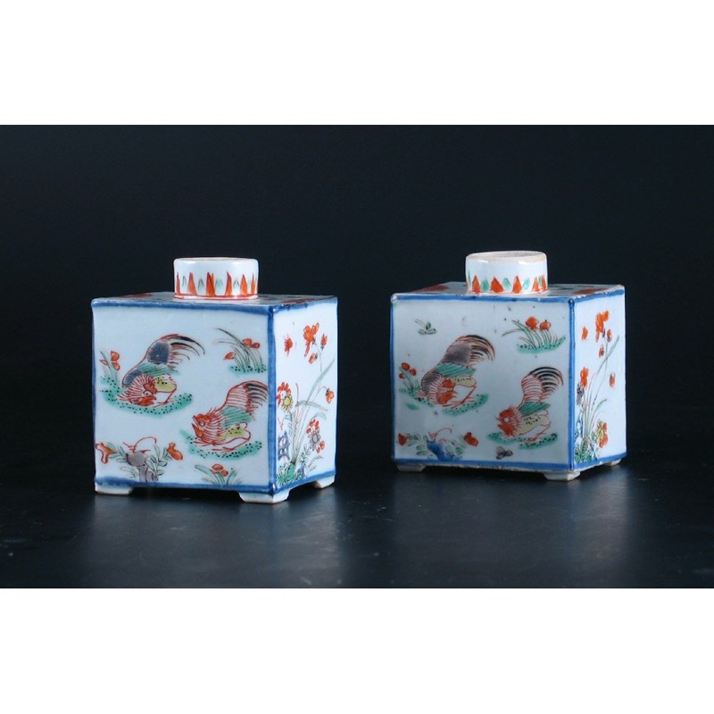 A pair of Chinese famille verte tea canisters, with rectangular bodies painted with scruffy cockerels scratching amidst flowers. A small repaired rim chip. Kangxi 1662-1722, 8cm. (2)