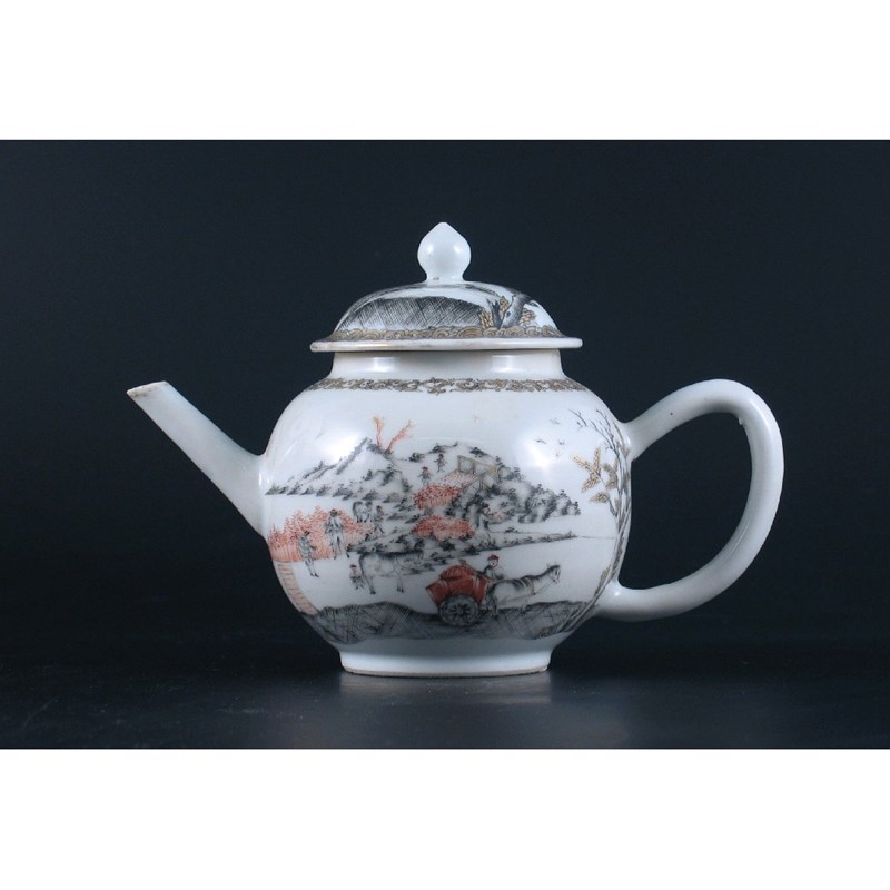A rare Chinese globular teapot and cover, made for the Dutch market, painted en grisaille and in iron red with a scene illustrating the building of the Zuider Zee dam, Qianlong 1736-95, 19.5cm.