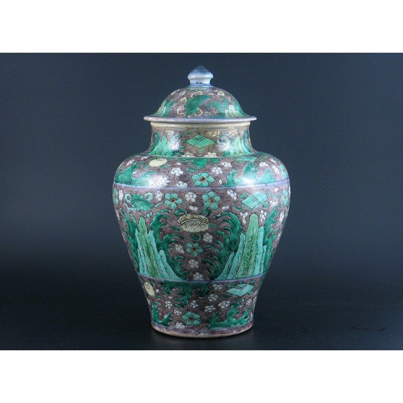 A Chinese Wucai baluster vase and cover, decorated with flower-heads, waves, rockwork and auspicious symbols on a scrolling manganese ground. Extensive restoration. 17th century, 36cm. (2)