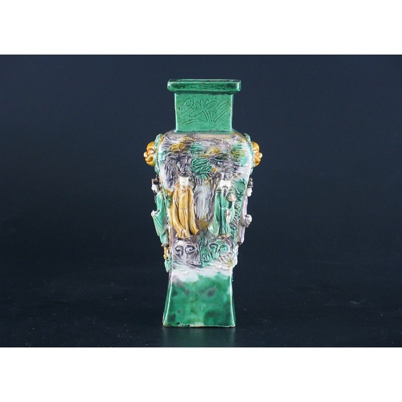A small Chinese egg-and-spinach glazed vase, the sides applied with figures, Kangxi 1662-1722, 15cm.