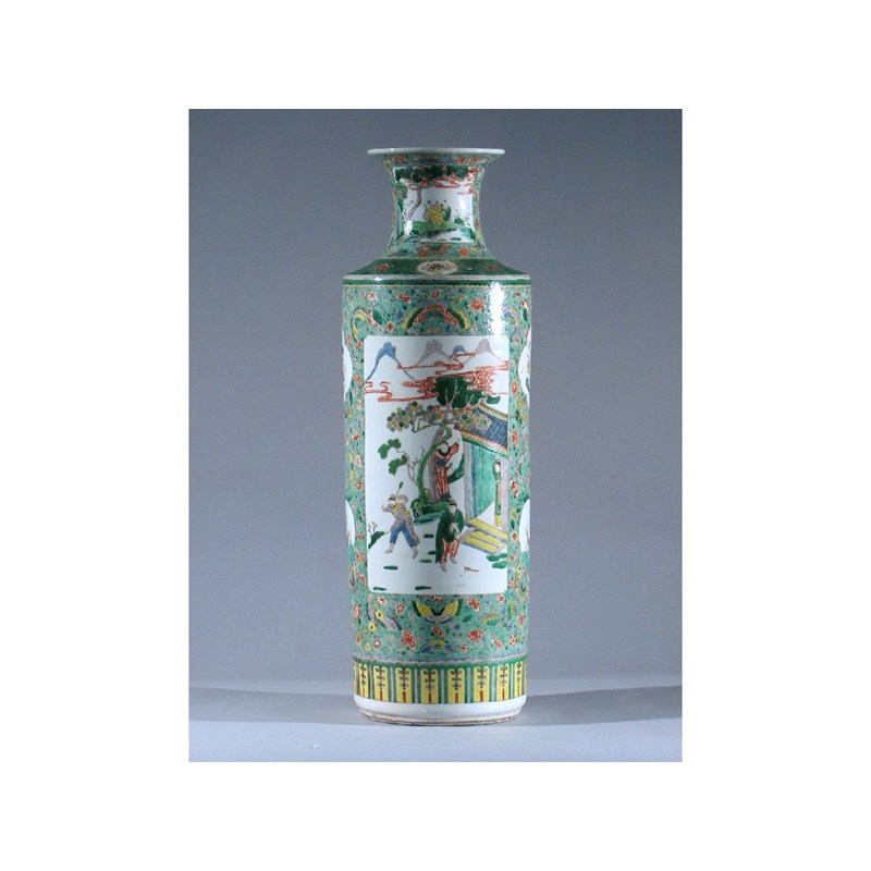A massive Chinese famille verte rouleau vase, decorated with panels of figures and with a tiger goring a man, 19th century, 73.5cm.
