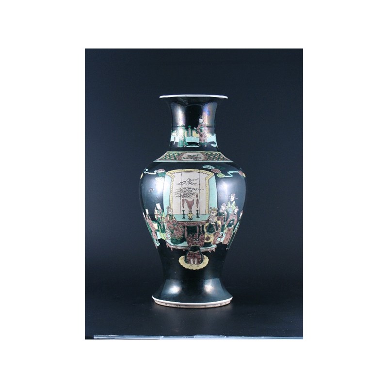 A Chinese famille noire vase, decorated with numerous figures in an interior. A crack to the neck. Chenghua mark but 19th century, 45cm.