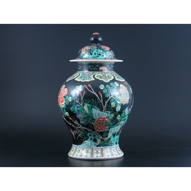 A Chinese famille noire baluster vase and cover, painted with flowers and rockwork, 19th century, 38cm. (2)