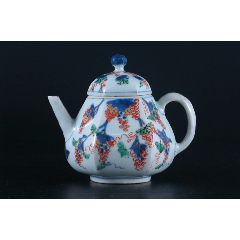 A Chinese verte Imari hexagonal teapot and cover, decorated with a fruiting grape vine. Retouching to the knop. 18th century, 12.5cm. (2)