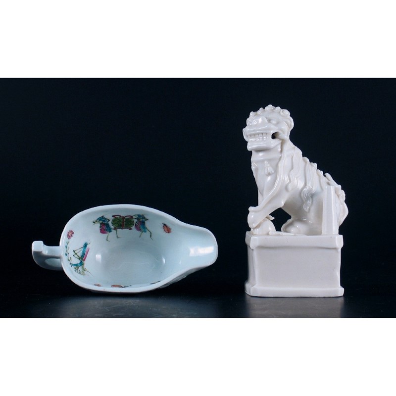 A Chinese blanc de Chine joss-stick holder, mounted with a dog of Fo on a rectangular plinth, Kangxi, and a famille rose libation vessel, painted with wasps, crickets and a praying mantis, 18th century, probably Fukien, 14cm. (2)
