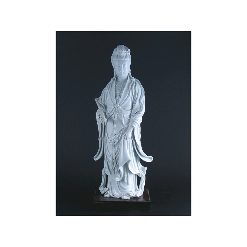 A massive Chinese blanc de Chine model of Guanyin, the Goddess of Mercy, standing holding a sceptre wearing flowing robes, raised on a wood stand, p'u-chi y impressed to the reverse. Minor repairs. 19th century, 57cm. (2)