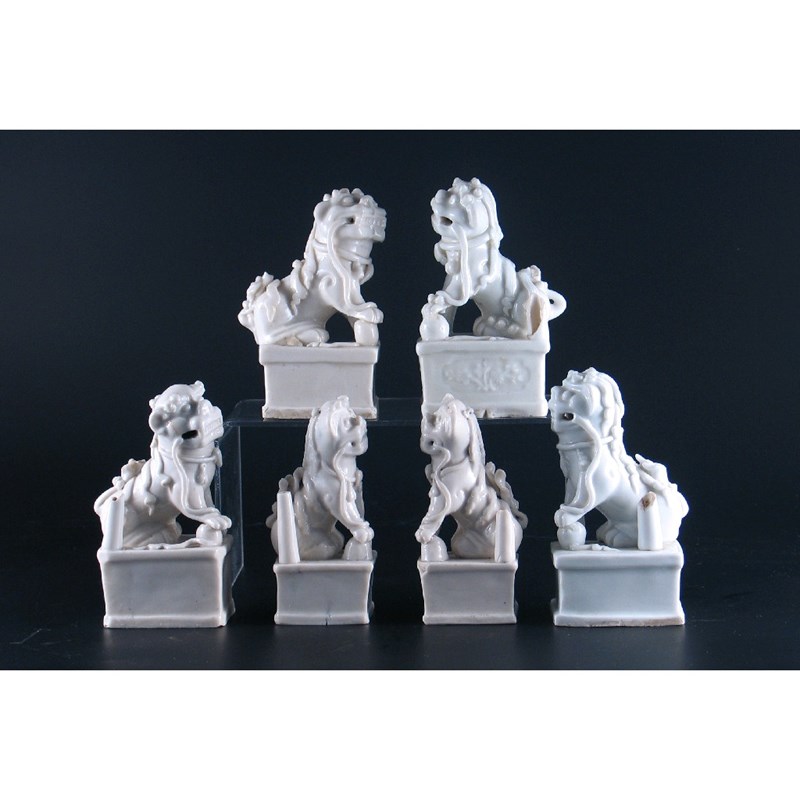 Six various Chinese blanc de Chine joss stick holders, modelled as Buddhist lion dogs. Some damage. All Kangxi 1662-1722, 13cm. (6)
