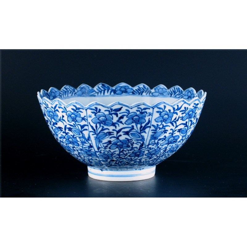 A Chinese blue and white moulded chrysanthemum bowl, painted with panels of scruffy birds amidst flowers, unmarked. A small repair to the inner footrim. Kangxi 1662-1722, 22.7cm.