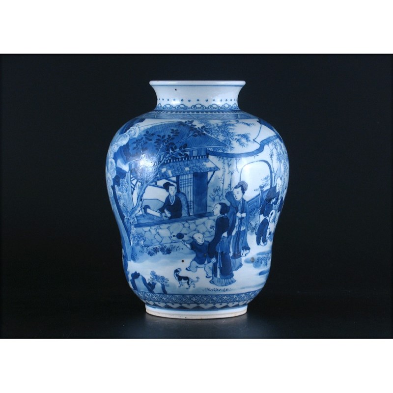 A Chinese blue and white vase, with an ogee shaped body, decorated with a scene of farmers, women and children, six character Kangxi mark but 19th century, 22.5cm.