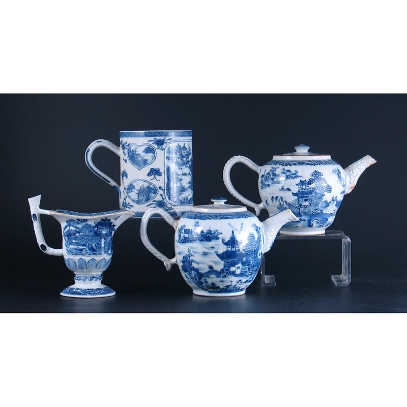 Two Chinese blue and white teapots and covers, a blue and white cylindrical mug and a helmet ewer, all decorated with pagoda landscapes. Some damage. All 18th century, 14cm. Max. (6)
