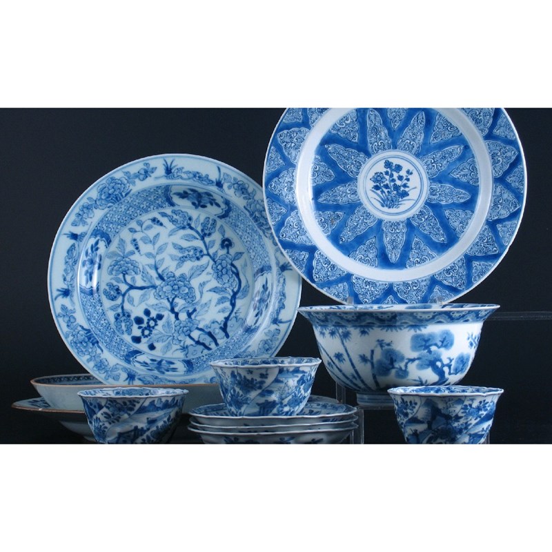 Chinese blue and white, comprising: two plates, three teabowls and saucers and three bowls. Some damage. All 18th century, 28.5cm. Max. (12)