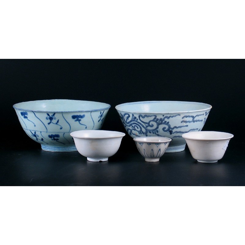 A pair of Chinese bowls from the Diana cargo, two small white glazed bowls from the Hatcher Cargo part one and a small blue and white bowl from the Hoi An Hoard, 15th century and later, 17.5cm. Max. (5)