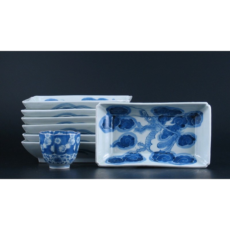 A set of seven Japanese blue and white rectangular dishes, painted with dragons amidst cloud scrolls and a small Japanese blue and white bowl, all 19th century, 21cm. (8)