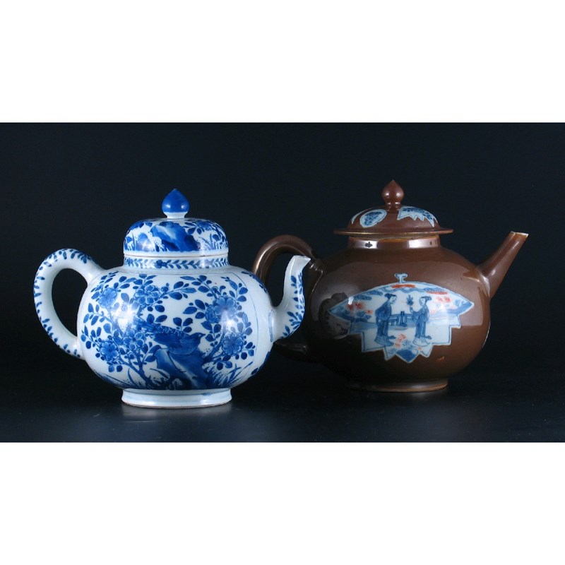 Two Chinese punch pots and covers, one blue and white, the other decorated with panels on a caf au lait ground, both Kangxi 1662-1722. The blue and white pot damaged. 27cm. Long. (4)