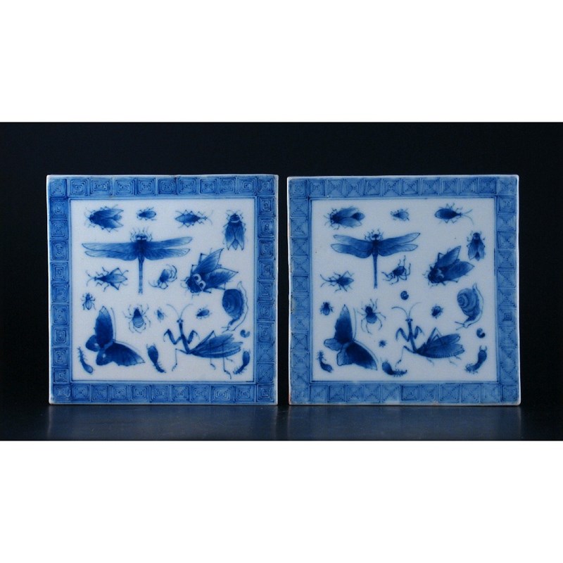 A pair of Japanese blue and white tiles, painted with bugs, grubs, spiders and snails, 19th/early 20th century, 15cm. (2)