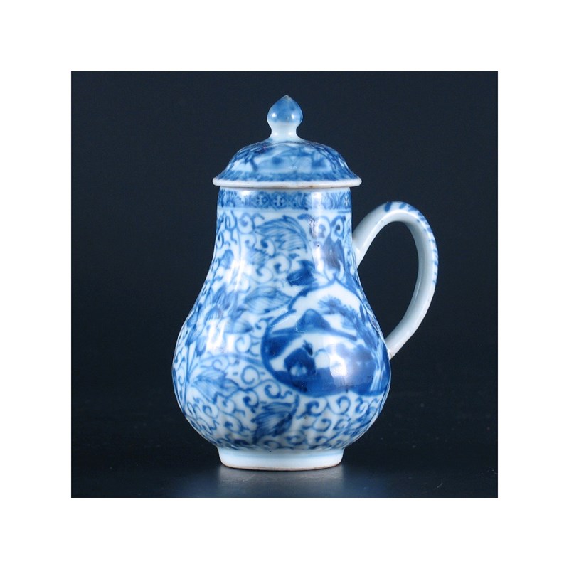 A Chinese blue and white mustard pot and cover, decorated with two panels of figures in landscapes on a lotus scroll ground. A crack to the base of the handle. 18th century, 12cm. (2)