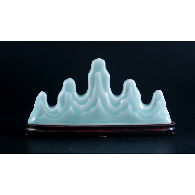 A Chinese celadon brush rest, modelled as a five peaked mountain and raised on a carved wood stand, 20th century, 16.8cm. Long. (2)