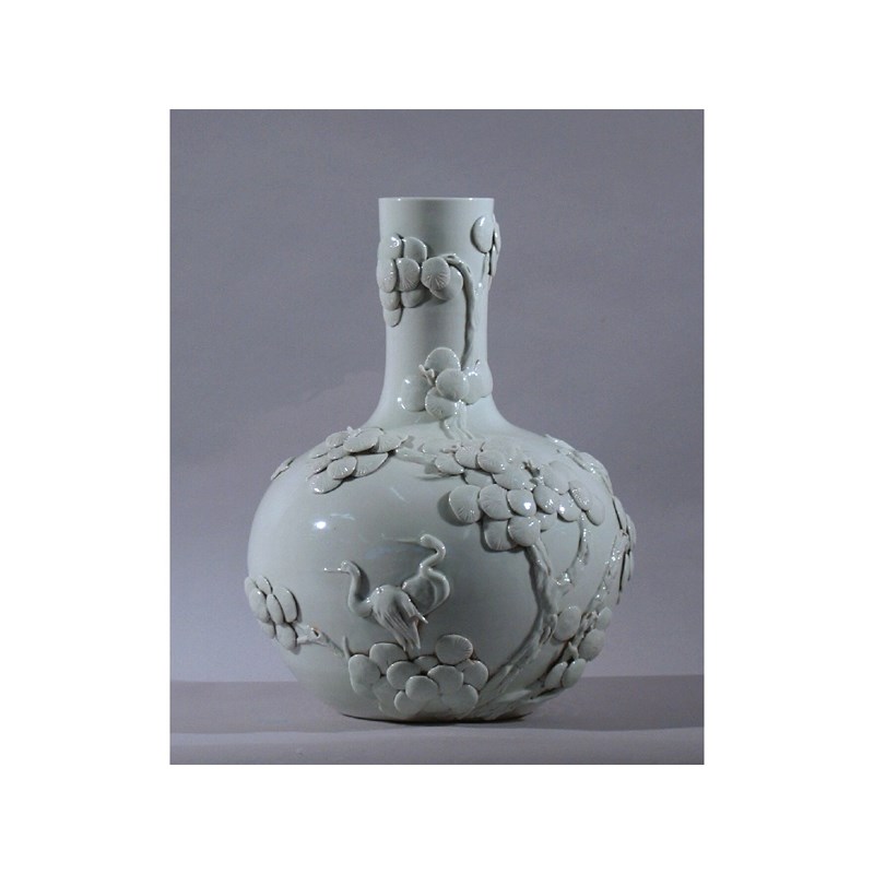 A massive Chinese white glazed bottle vase, the body applied in relief with two pairs of cranes standing beneath a prunus tree, Qianlong mark but later, 58cm.