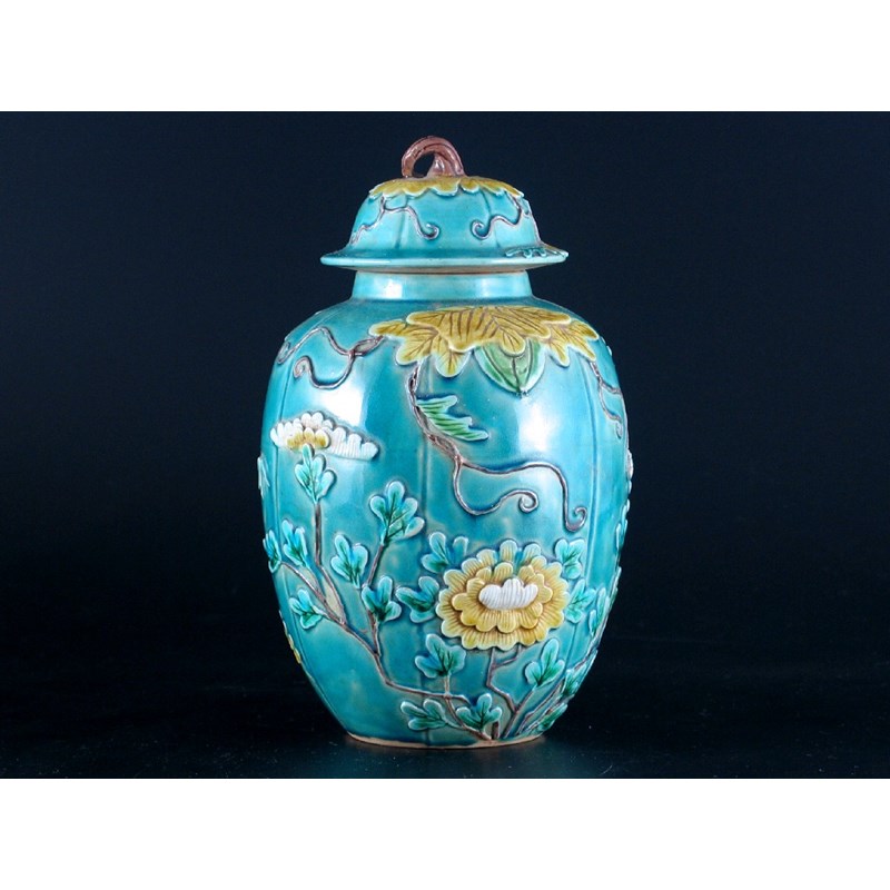 A Chinese turquoise glazed vase and cover, moulded with chrysanthemum and a butterfly, a moulded Qianlong mark but later, 21cm. (2)