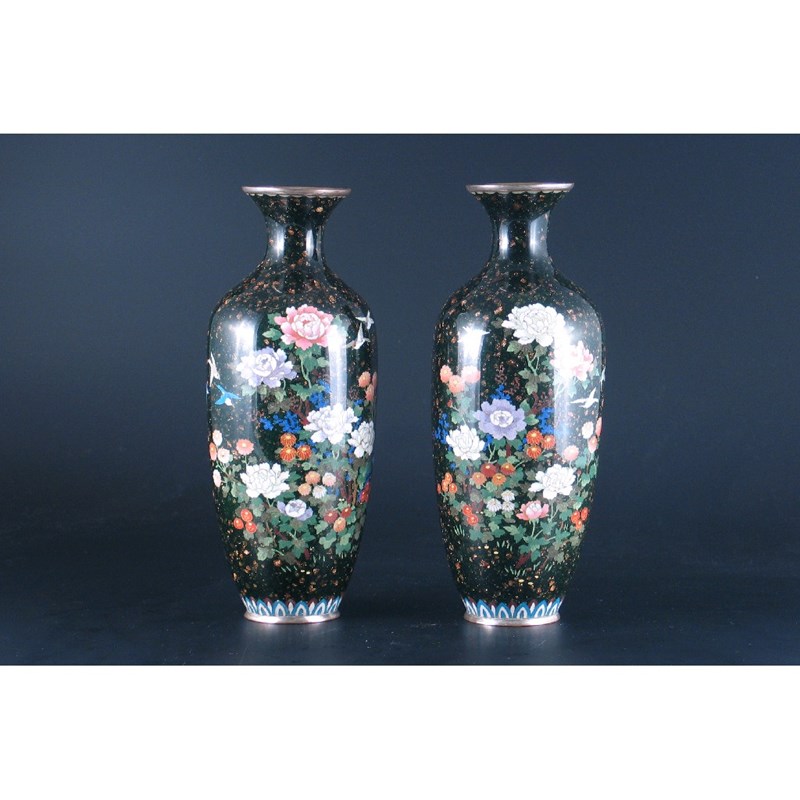 a pair of Japanese cloisonn vases, decorated with birds in flight converging upon a multitude of flowers, the dark ground flecked with aventurine, Meiji 1868-1912, 24cm. (2)