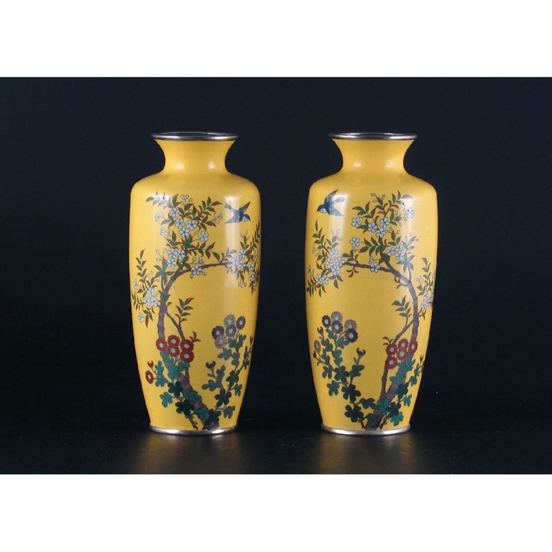 Two pairs of Japanese cloisonn vases, both decorated with flowers, one pair with a yellow ground, the other on a blue ground, the latter cased. Minor faults. All 1st half 20th century, 18.5cm. and 9cm. (4)