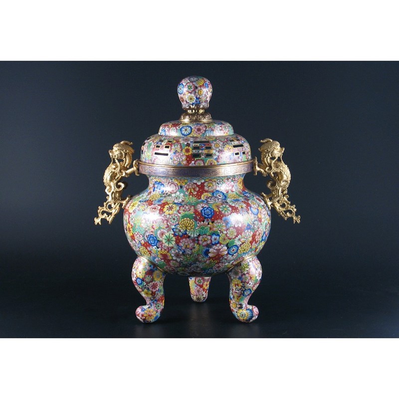 A large Chinese cloisonn mille fleur tripod censer, with a reticulated cover and dragon handles, 20th century, 35cm. (2)