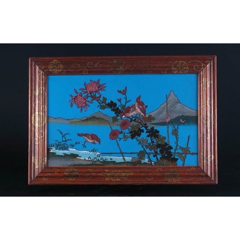 A Japanese cloisonn panel, decorated with three sparrows perched on and under chrysanthemum at the waters edge with mountains beyond, original gold lacquer decorated frame, c.1900, 25cm. x 36.5cm. Overall.