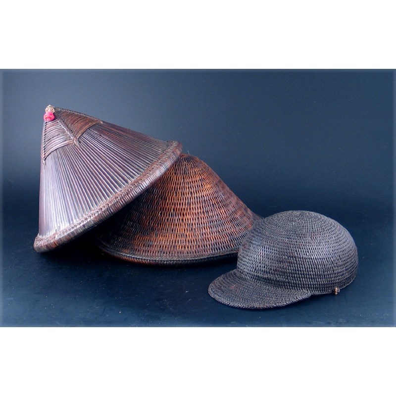 Three South East Asian wicker hats, one a jockeys cap, the others conical. (3)