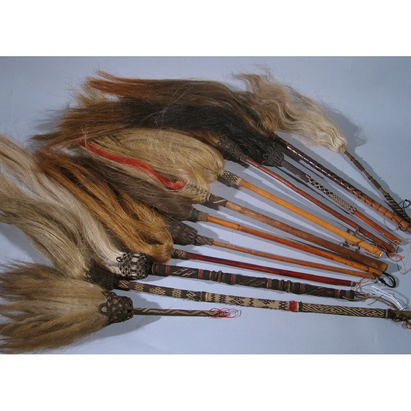 Twelve fly whisks, the handles variously decorated with geometric weaving, wirework and polished and lacquered wood. (12)