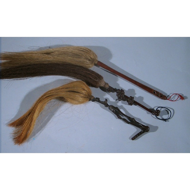Three Chinese fly whisks, one with a finial carved as a monkey holding a pole, the others with knobbled and gnarled handles. (3)