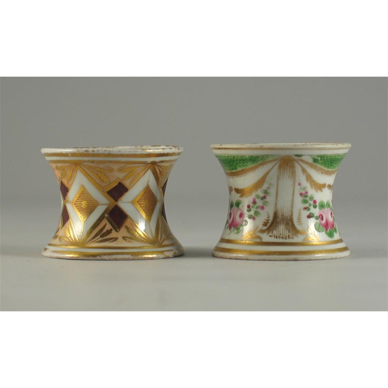 Two English porcelain egg rings, one painted with flowers, the other with diamonds. Both with wear. Early 19th century, 5cm. (2)