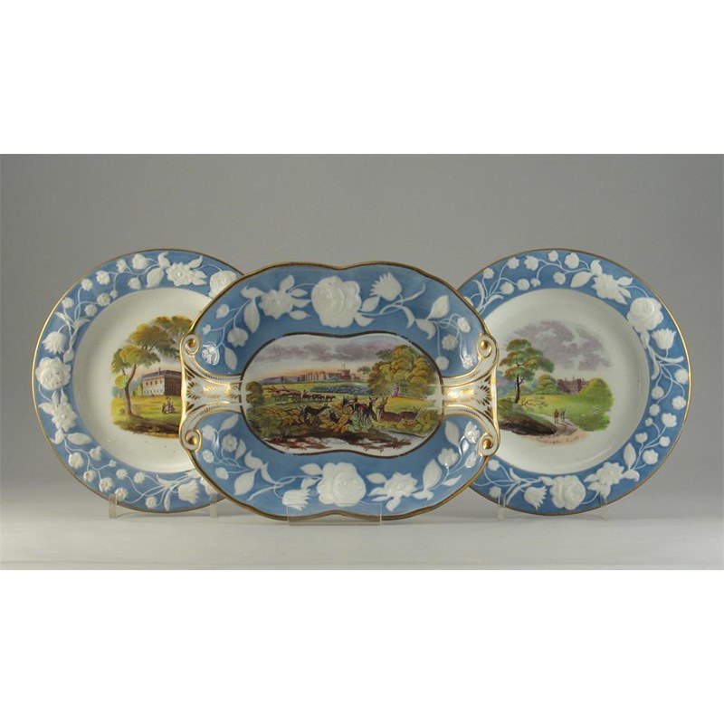 A New Hall dish and two matching plates, decorated with views of Windsor Castle, Twickenham Meadows and Haddington Castle, no marks. Slight wear to the gilding. c.1820, 23.5cm. Max. (3)