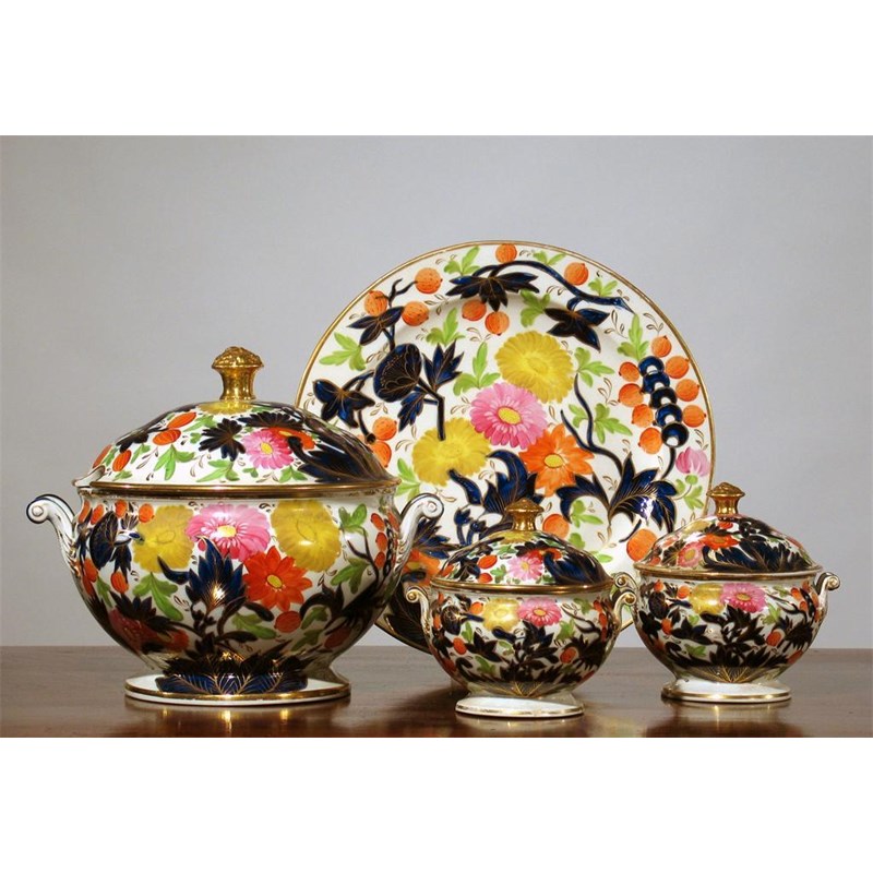 A Coalport soup tureen, cover and stand, a pair of matching sauce tureens and covers and two rectangular dishes, all lavishly painted with colourful flowers, fruit and foliage, the dishes with impressed marks. Minor damage and wear. c.1810, 49cm. Max. (9)