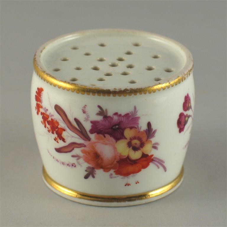 A Swansea cylindrical sander, painted with three flower sprays between gilded borders. A little wear to the gilding. Early 19th century, 5cm.